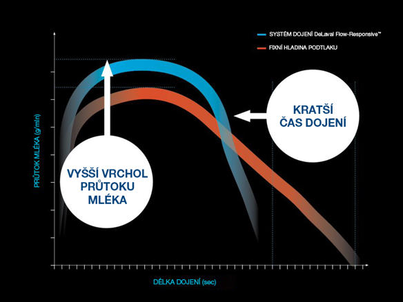 Další funkcí technologie Flow-Responsive Milking je Flow-Responsive Vacuum, což představuje revoluční změnu v aplikaci hladiny dojícího podtlaku. Na rozdíl od pevných hladin podtlaku se Flow-Responsive Vacuum přizpůsobuje aktuálnímu průtoku mléka. To nejen optimalizuje dojení, ale také chrání zdraví struků. S 9% nárůstem maximálního průtoku mléka a pozitivními účinky na zdraví konečků struků Flow-Responsive Vacuum stanovuje nový standard v efektivitě dojení. Zrychluje proces dojení, umožňuje platformě otáčet se rychleji, což zajišťuje větší průtok a kratší směny."
