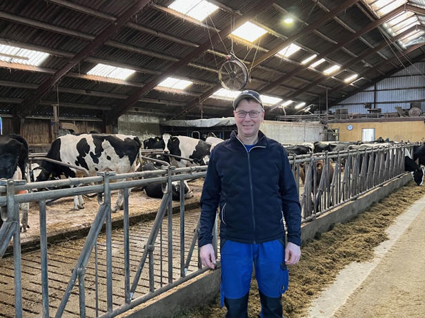 Bjarne Refsgaard, Vildbjerg, malker 125 køer i en 2x8 sildebensstald. Han fik i 2021 installeret tre DeLaval staldventilatorer DDF1200 over sengebåsene og en i den ene af malkestalden, hvor opsamlingspladsen er. Før han fik ventilatorer, havde han kun naturlig ventilation igennem stalden.