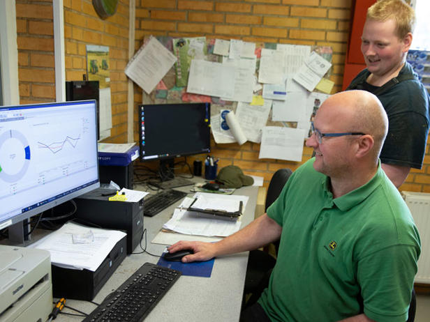 << Køerne på Skovgaarden malkes i en af Danmarks første HBR karruseller med 24 pladser, indstalleret for godt 20 år siden. Den har kørt problemfrit alle årene, og vi regner da med, at den holder 10 år endnu, understreger Carsten, her ved computeren i staldkontoret sammen med fodermester Tobias Hundebøl.