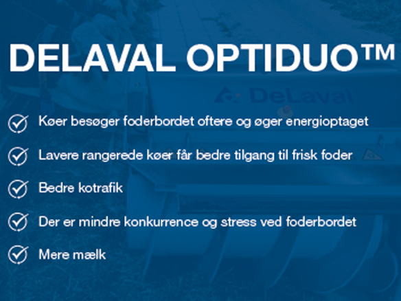DeLaval OptiDuo er en automatisk foderskubber, som blander foderet, hvilket gør det mere appetitligt og indbydende for køerne. Derudover forhindrer den, at foderet bliver sammentrykket, der betyder højere foderoptag og mere mælk. OptiDuo’s spiralformede snegl roterer gennem foderet på en enestående måde, som sikrer, at foderet skånsomt flyttes frem til dyrene.