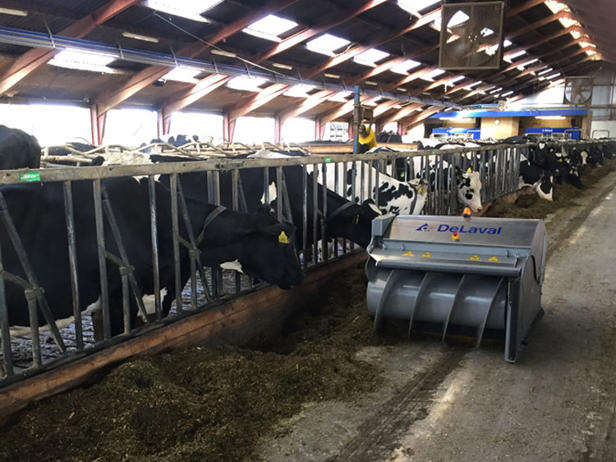 Bjarne Jensen får god hjælp af DeLaval OptiDuo, som både blander og skubber foderet. - Vi ved, at der altid er frisk foder hos køerne, og malkninger er steget.