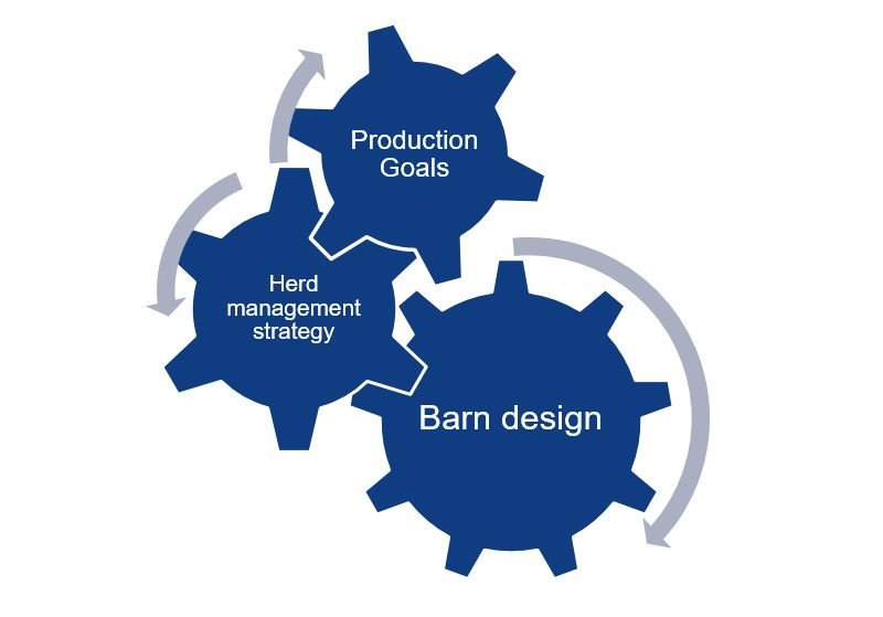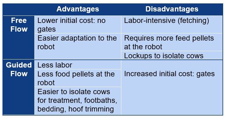 Depending on the goals of the dairy, many operational items must be established during the planning of the retrofit design. One major consideration will be the gating and flow within the barn to and from the robot(s). Free flow and guided flow are two options. Free flow cows are allowed to walk around freely wherever and whenever they choose within the barn, without any gates. Guided flow allows the cows to go from one area of the barn to another in an organized procession with a series of gates. This decision plays a major role in retrofit planning.