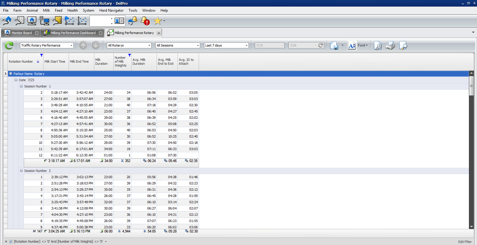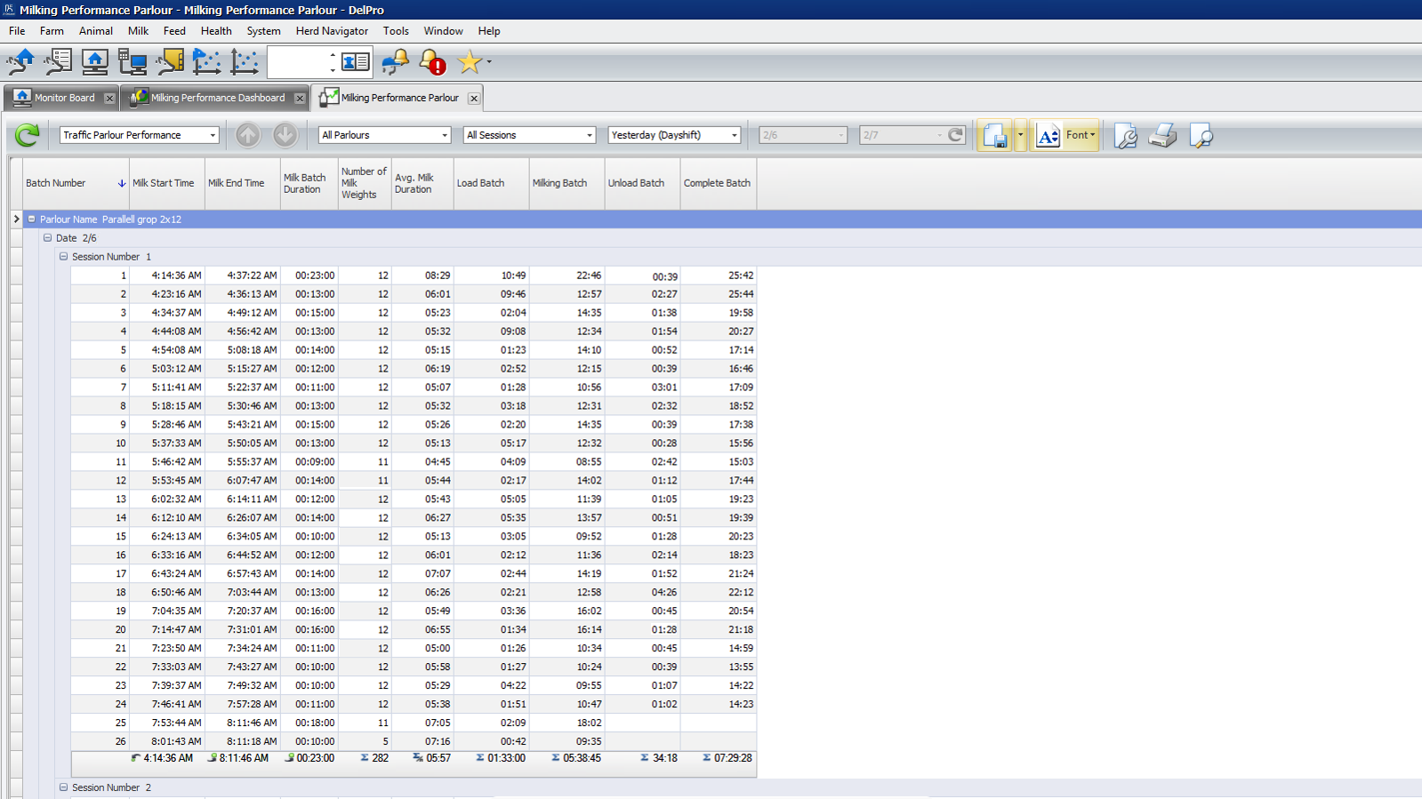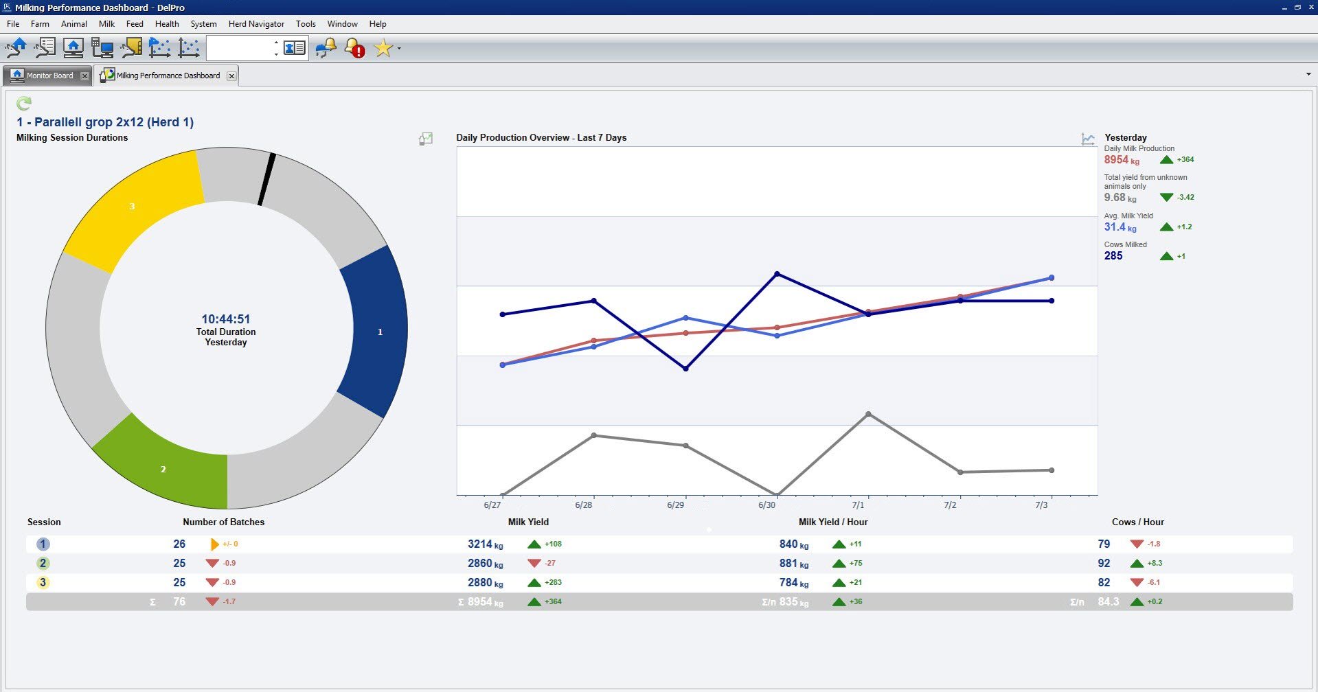 With the DelPro FarmManager Milking Performance Dashboard you get a quick insight in the throughput of your milking system in terms of cows milked per hour (rotations and/or batches milked) and the harvested yield across the milking sessions. The performance for yesterday is compared to the average of the 7 previous days and changes are quickly highlighted by means of the coloured triangles (▼▲►).