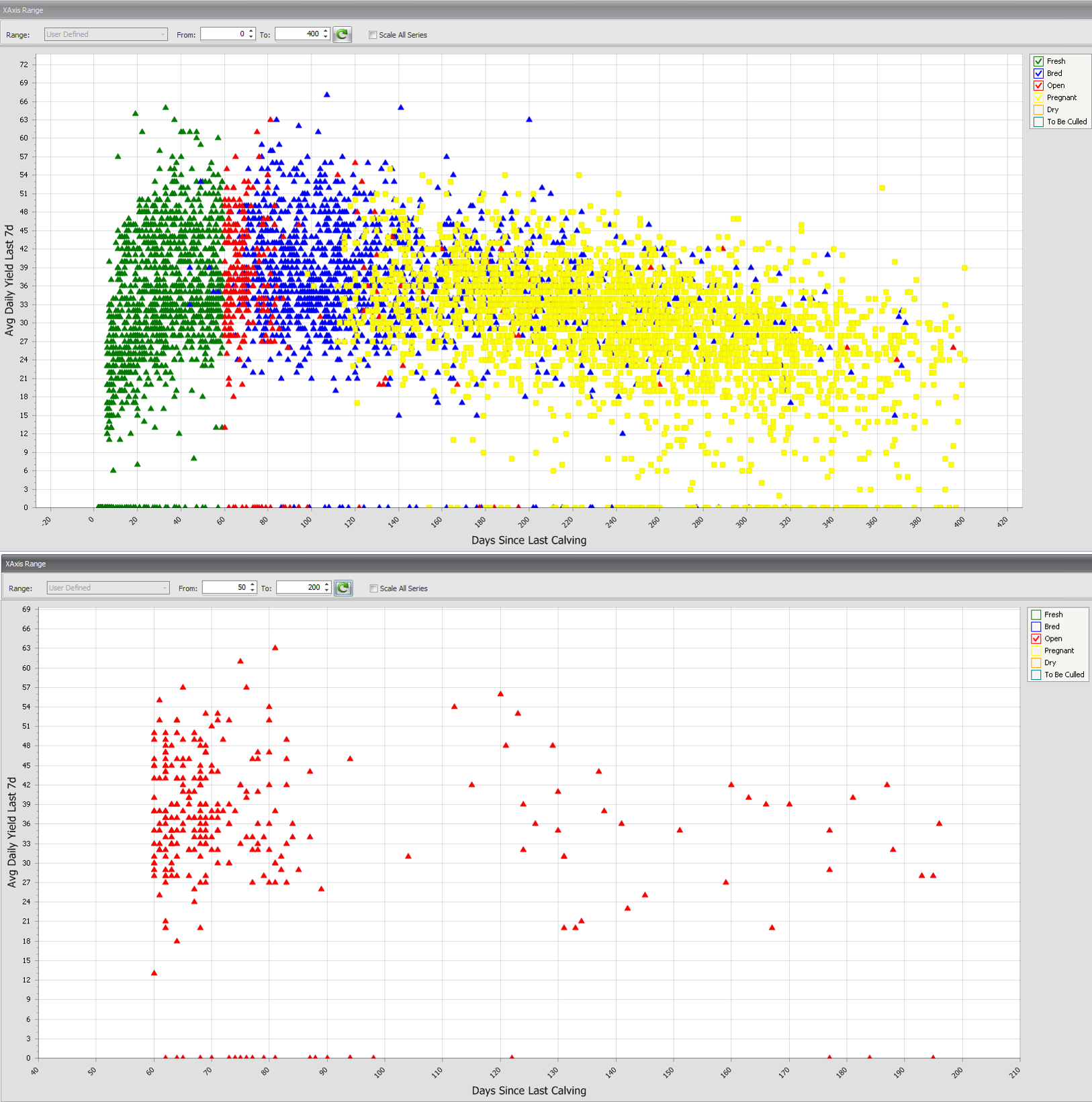 Colouring cows according to the reproduction status helps this focus. Quickly unticking the boxes on the Herd Reproduction Distribution (Figure 1) graph lets you easily remove the cows not in focus. The cows that are dry, pregnant, bred, fresh and those that have actively been chosen not to breed (cull cows) can all be taken away leaving just the cows that are open (with red ▲).
