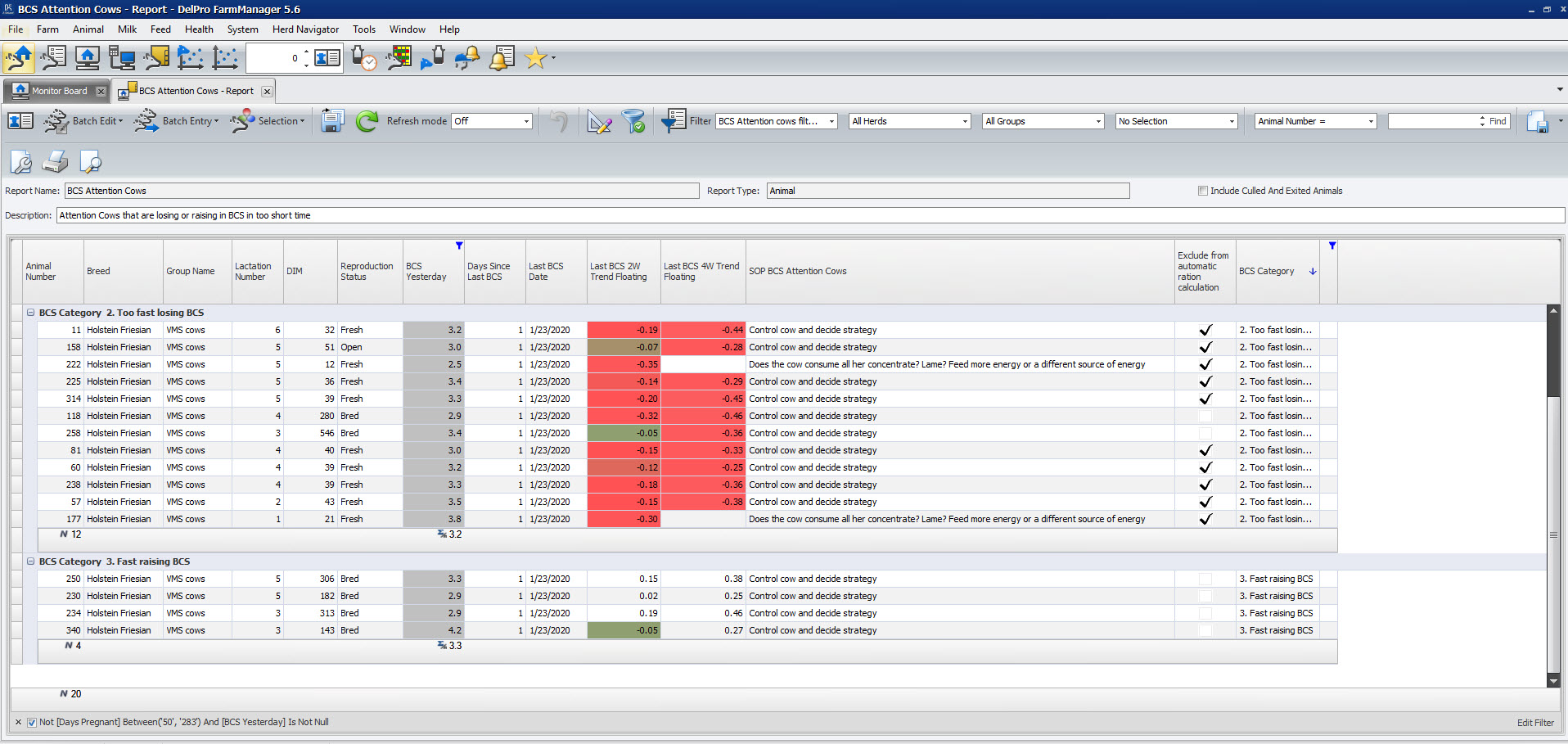 It is important to keep an eye on the attention lists of the cows themselves. DelPro generates a report with the deviations and gives the action needed. Do you want to change the concentrate ration? Move her to a new feed group? Cows appear on the attention list if they are gain or lose BCS within a short period of time.