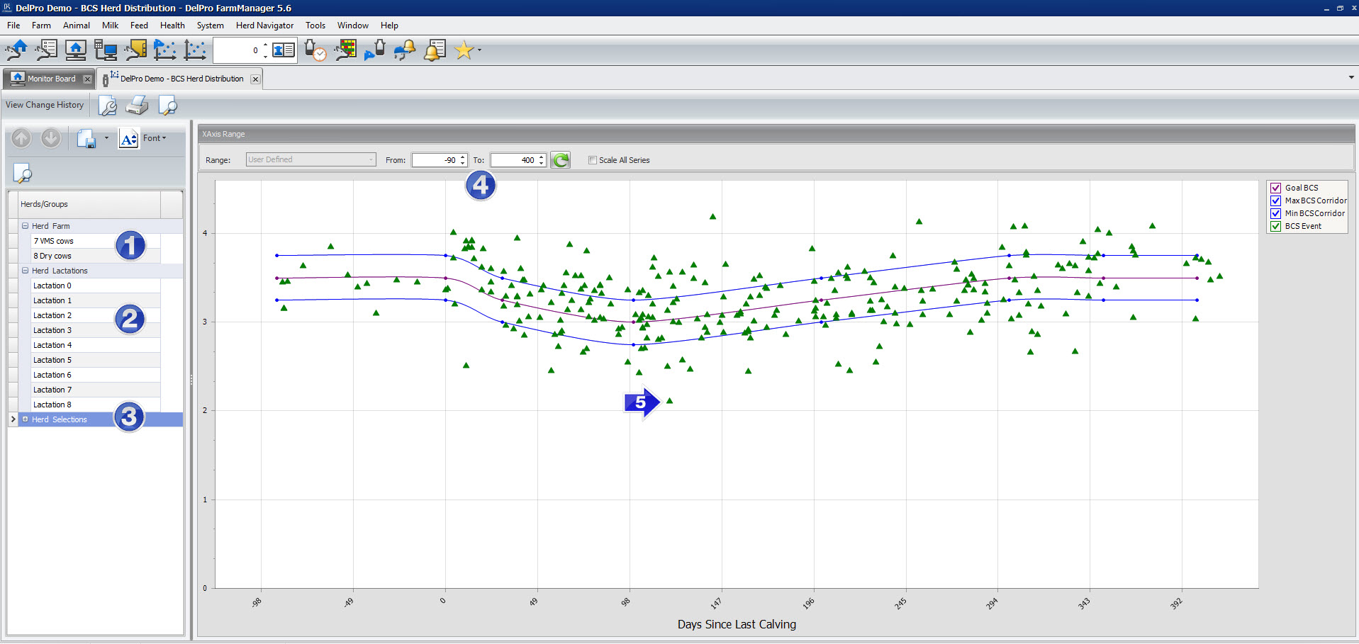 Picture : DelPro Farm Manager BCS Distribution graph, giving options to select the herd, groups or selections of cows.