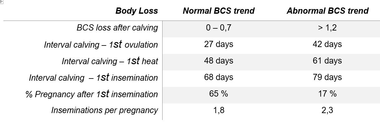 Tabel 1. BCS Loss effect on reproduction results (Source: Butler 2000; Garnsworthy en Webb 2002; Guthrie and West 2003)