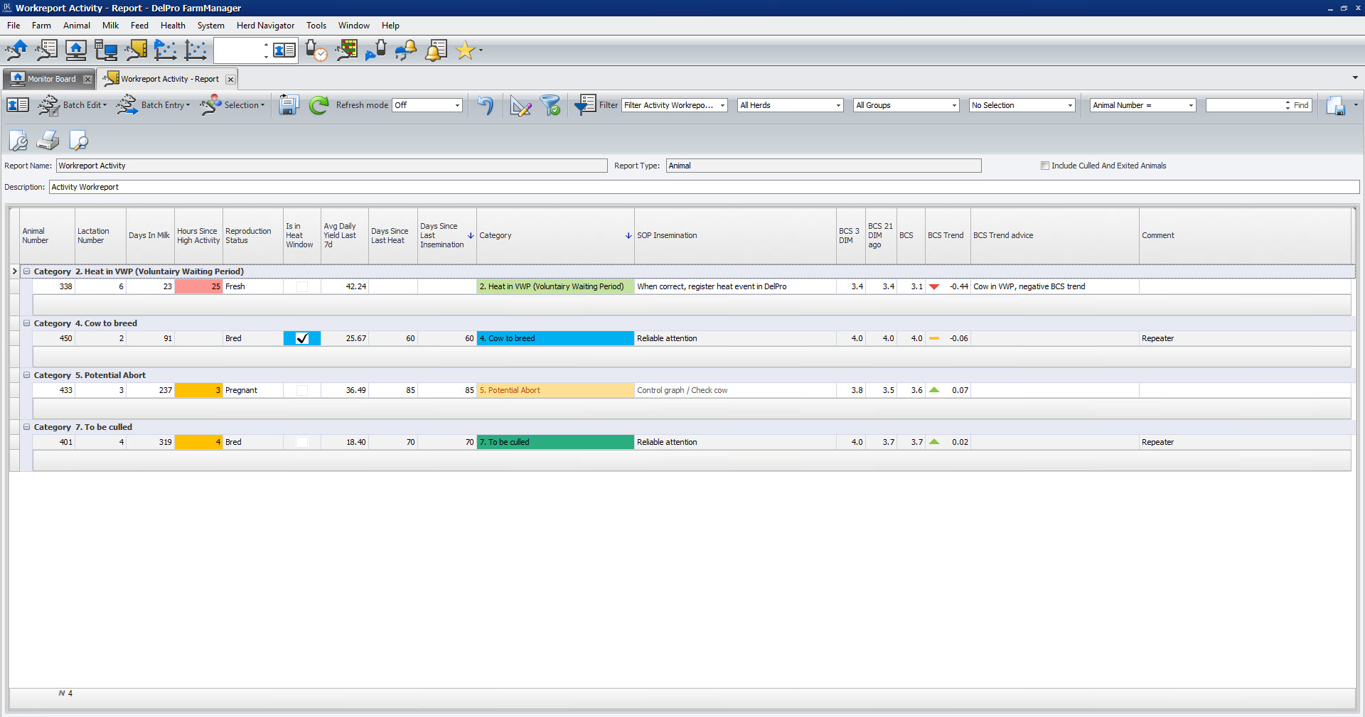 The information from the DeLaval Body condition score System BCS can be used to decide when to start inseminating cows, by adding the BCS trend and value to the Cows to Breed reports, so only cows with increased body condition or where the drop in body condition has stop are inseminated.