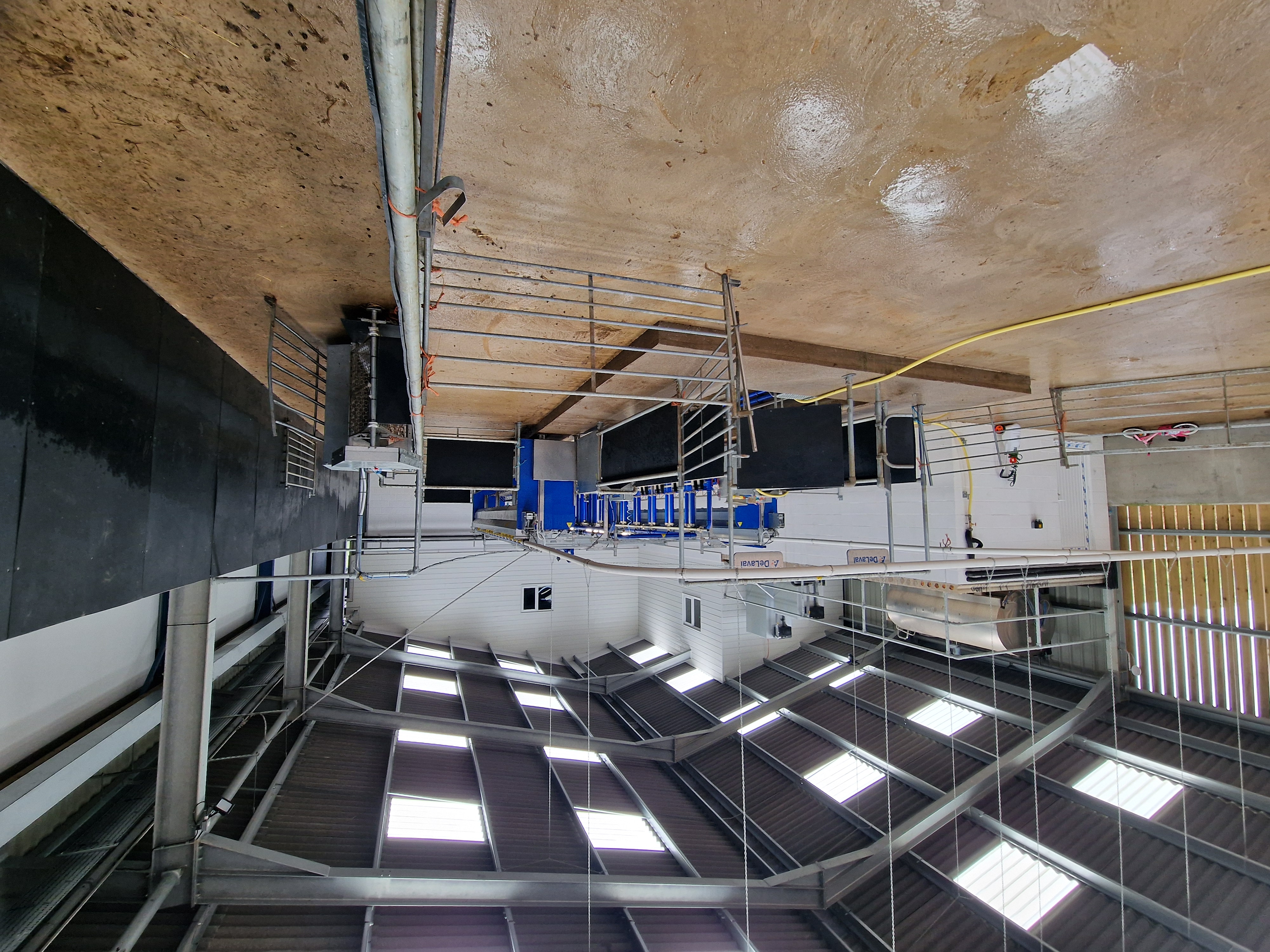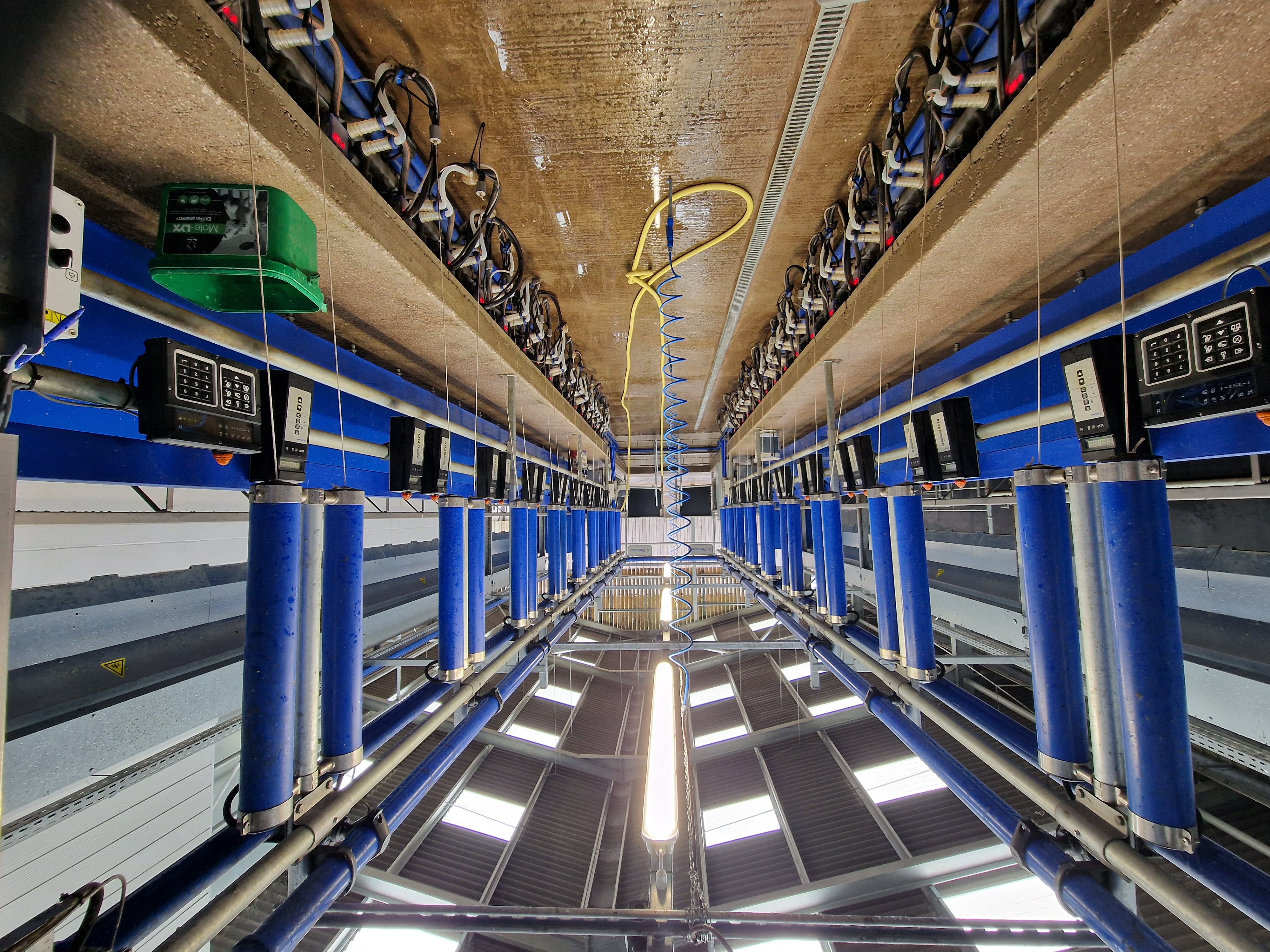 There are cluster removers, and sheep are fed in two drops during milking to encourage them to stay in the parlour until milking has been completed. The ewes have ear tags which provide milk yield data and there is an auto-shedding function at the exit to separate problem ewes into a pen.