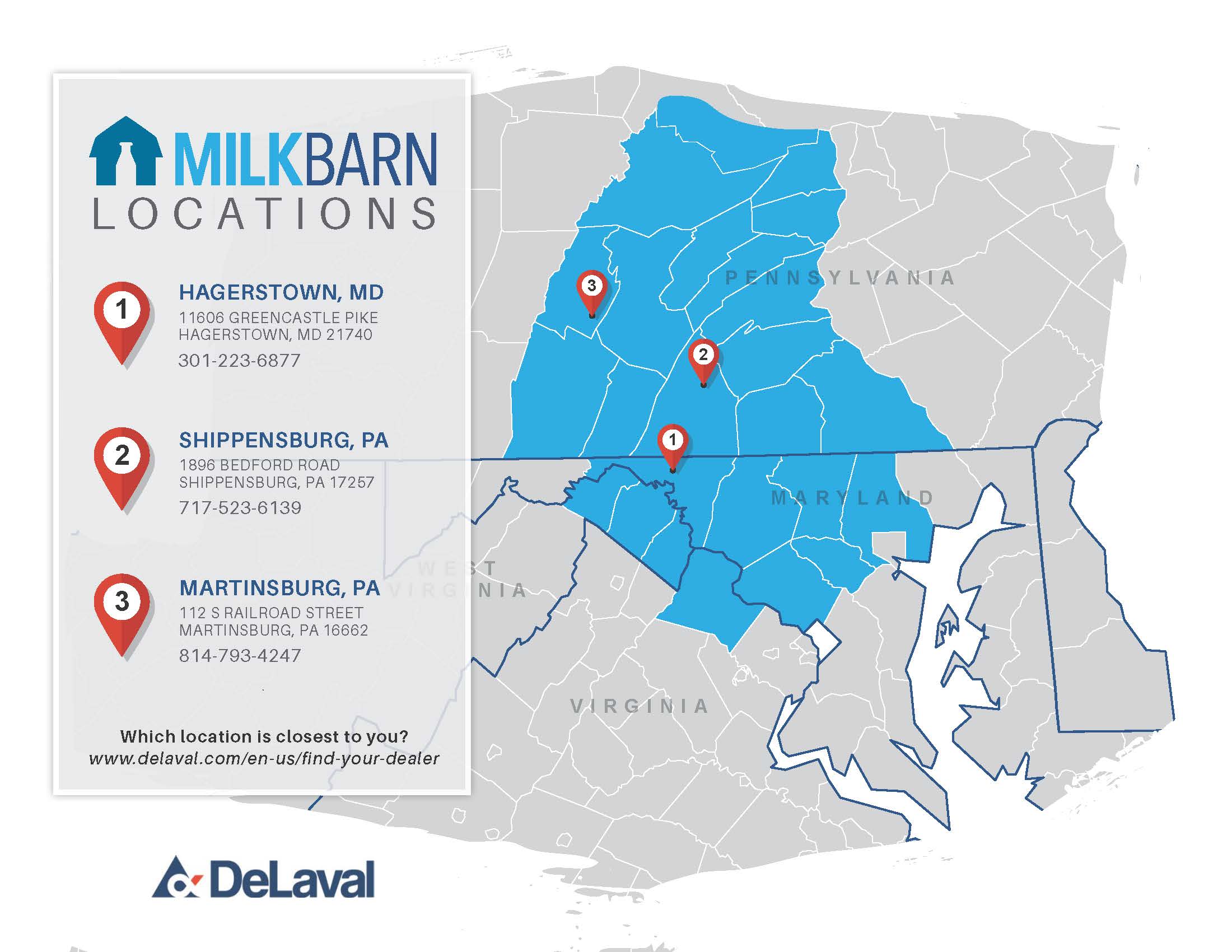 The team at Milk Barn will serve dairy producers out of three, key locations: Hagerstown, MD, Shippensburg, PA, and Martinsburg, PA. Although the former Agri-Service, LLC location at Belleville, PA, has closed, customers in the area will continue receiving the day-to-day service and support they need for success on their dairy operations.