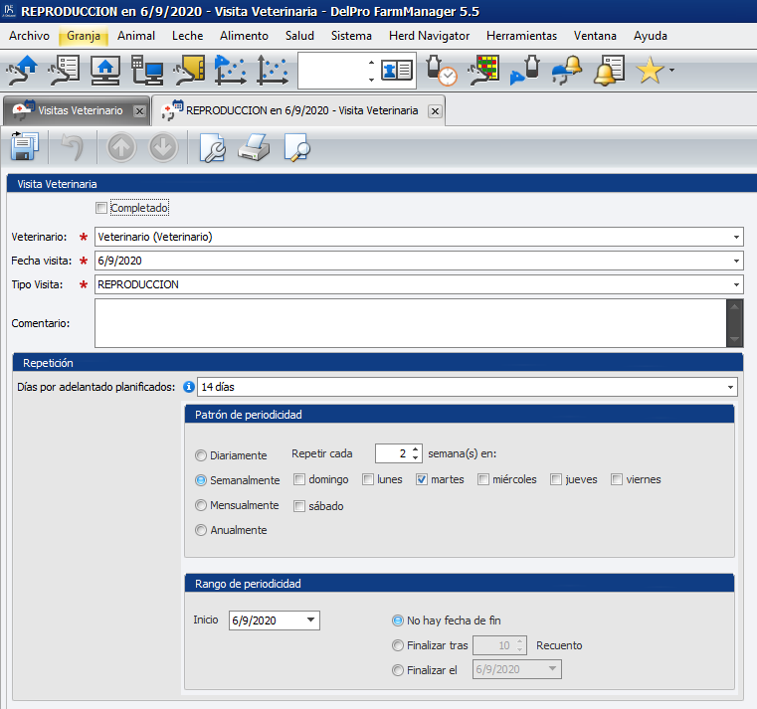 En un artículo anterior aprendimos a crear un tipo de visita veterinaria, en la que se pueden especificar los criterios de las vacas que se quieren invitar a la visita veterinaria (por ejemplo, control de vacas frescas, control de preñez, etc). Después de añadir los tipos de visita veterinaria podemos empezar a programar las visitas según el tipo de visita. Para las visitas que ocurren regularmente a la misma hora, se pueden planificar automáticamente esas visitas; cada semana, cada mes, cada tercer martes a las 10:00... Lo que usted desee. Esto es especialmente útil en las granjas más grandes, donde se pueden utilizar diferentes tipos de visitas veterinarias; como el tipo de visita veterinaria para los controles de preñez o el tipo de visita de control para las vacas frescas, que se hacen en diferentes momentos.