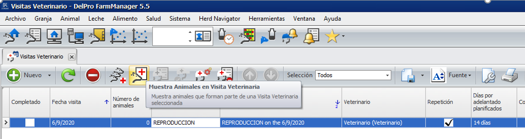 Utilizando la relación de animales de la visita veterinaria (ver imagen abajo), se mostrará la lista de trabajo con la información de los animales de la visita veterinaria. Este informe puede utilizarse como lista de trabajo durante la visita para, después, reportar la información directamente en las fichas de los animales.