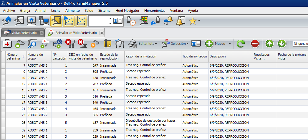 Los animales seguirán siendo invitados a la visita veterinaria automáticamente mientras cumplan con los criterios del filtro de la visita veterinaria, o hasta que sea excluido manualmente (animales bloqueados). Por ejemplo, si después de una visita veterinaria no se informa de que una vaca ha sido sometida a un control de preñez, seguirá apareciendo en el filtro de control de preñez, que será utilizado en posteriores visitas veterinarias. Finalmente, es necesario marcar la visita veterinaria como completa para pasar a la siguiente visita planificada automáticamente. Incluso si no ha tratado a los animales, o se ha saltado la visita, marque como completado.
