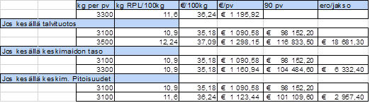 Tässä esimerkkilaskelma samaiseen tutkimukseen liittyen, jossa maitomäärän menetykseksi on laskettu kolmen kuumimman kuukauden ajalta 400 litraa päivässä ja pudotuksen vaikutus tilan tuloihin. Maidon hinta on tässä maidon pitoisuuksiin (RPL = rasva, proteiini, laktoosi) sidottua.
