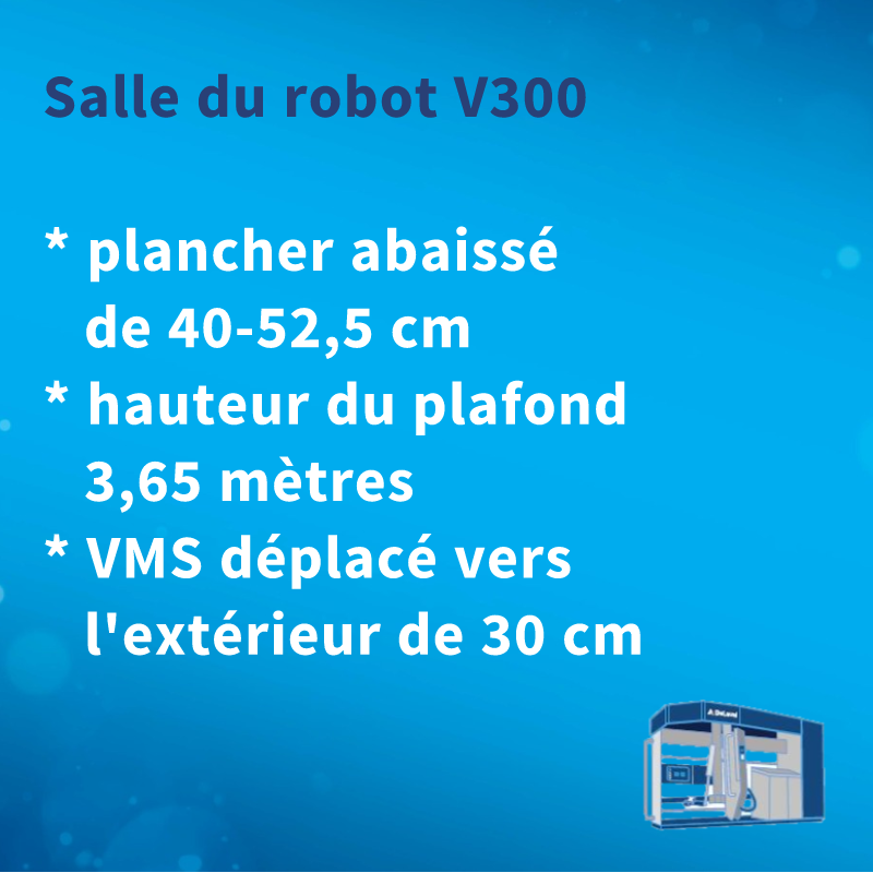 Même si une fosse à l'intérieur d'une salle de VMS n'est pas obligatoire, un abaissement du niveau du plancher de 40 à 52,5 cm est recommandé pour le V300. Cette fosse est légèrement inférieure à celle que nous avons vue sur de nombreuses installations VMS Classic par le passé. La hauteur de plafond recommandée pour la salle du V300 est d'environ 3,65 mètres. Cependant, celle-ci peut être réduite, si d'autres mesures sont prises pour faciliter l'entretien.