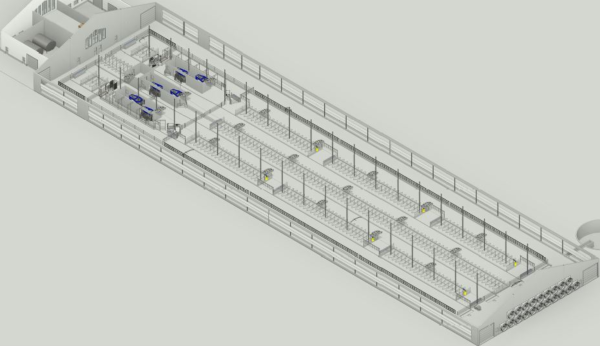 - Système de gestion du fumier : Raclettes dans les allées & raclette dans un caniveau transversal menant à la fosse de transfert