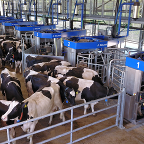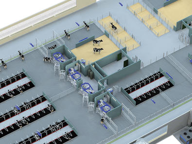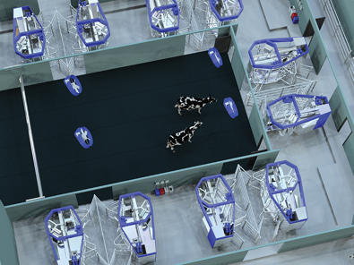 Avec des robots remplaçant le travail de traite, un parc de tri et les mêmes parcs de vaches, une installation de Traite robotisée VMS en lots avec les robots dans le Centre de traite, permet la cohérence, les données et jusqu'à 8 vaches par heure par robot.