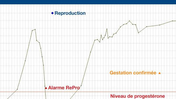 - La progestérone est mesurée en milligrammes (mg) et une ligne de référence est définie pour montrer le niveau du cycle de reproduction.