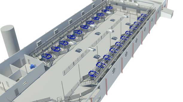 - Robotizált fejőházba terelés – A csoportokat egy robotizált fejőházba terelik, ahol több VMS egység helyezkedik el egy parallel fejőházhoz hasonló elrendezésben, központi várakozóterülettel.