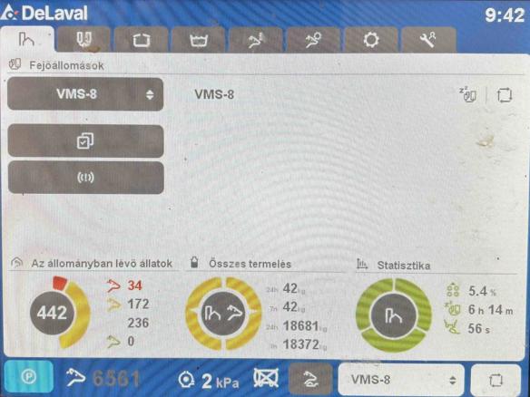 Kép: Agro-Lehel Kft., Jászberény, 2025. január – A V300 fejőrobot érintőképernyőjén a telepi mutatók, középen lent az aktuális fejési eredmények láthatóak