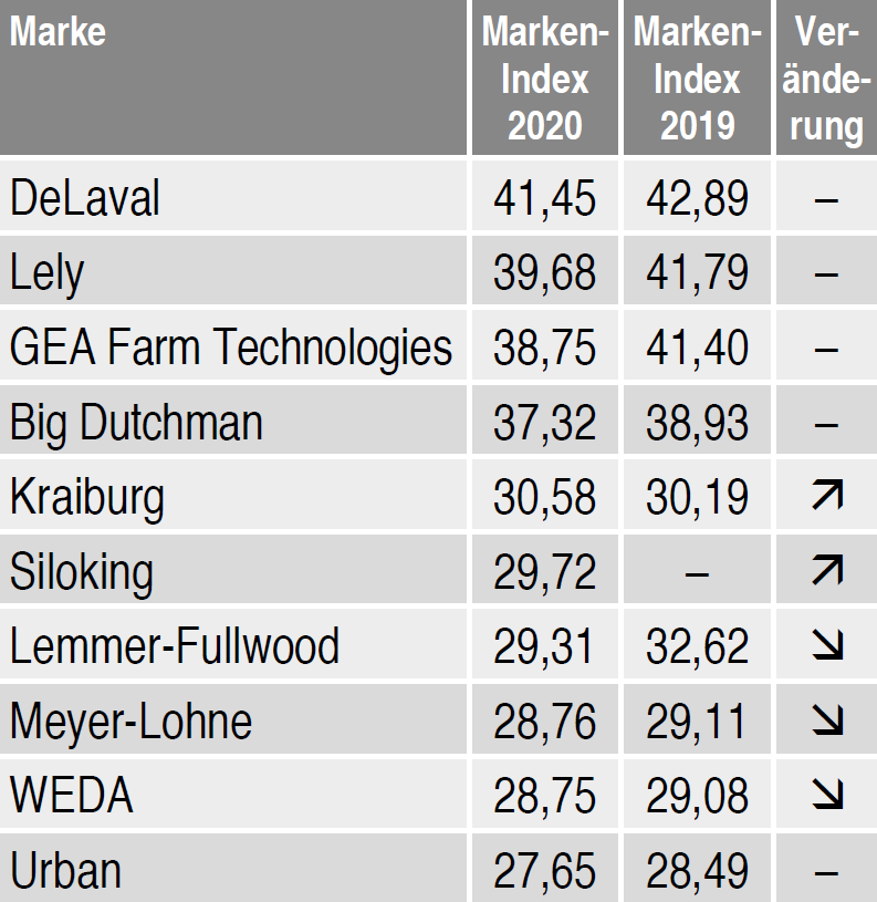 A DLG éves felmérésében 700 német gazdálkodót kérdeztek meg telefonon arról, hogyan vélekednek az egyes márkákról a következő hét kategóriában: mezőgépek, állattenyésztési technológia, takarmányozás, agrokémia és vetőmagok, bank és biztosítás, kereskedelem és szolgáltatás, megújuló energia. A márkaindex az alábbi négy részpontszám alapján kerül megállapításra: márkaarculat, márkaismeret, márkateljesítmény és márkahűség. Összesen legfeljebb 100 pont érhető el. A koronavírus járvány miatt a felmérés eredményét a korábbi évekkel ellentétben, nem 2020 novemberében, hanem idén februárban hozták nyilvánosságra.