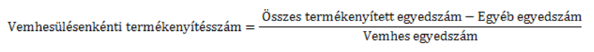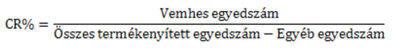 Egy kiválasztott dátumtartományra vonatkozóan a DelPro FarmManager a vemhesülési arány (CR%) meghatározásához számításba veszi a tenyésztésben lévő egyedek számát (a táblázat Összes egyedszám oszlopa), a vemhesülések számát (Vemhes egyedszám), a megerősített sikertelenségeket (Üresen maradt egyedszám) és az ismert eredmény nélküli termékenyítések számát (Egyéb egyedszám). A CR% számítási képlete: a megvalósult vemhességek száma osztva az adott időszakban történt összes termékenyítés az Egyéb egyedszámmal csökkentett számával. Ezen kívül van egy oszlop, amely azoknak a vemhes teheneknek a számát tünteti fel soronként, amelyek később elvetéltek (Vetélési egyedszám).