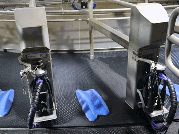 一か月程度経ってみて、ストール部分に設置している青いカウロケーター(※写真)が、自然と牛の脚を開いて搾乳クラスターをつけやすくさせてくれるので、作業がとても楽になったな、と感じました。ほら、脚癖の悪い牛って蹴ったり、クラスターを落としたりしますよね。滑って蹴る牛がいなくなっておとなしくなったな、と思いました。