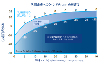 もしウィンドチルが‐32°C (-25°F)以下で乳頭が濡れている場合、1分以内に凍結する可能性があります。