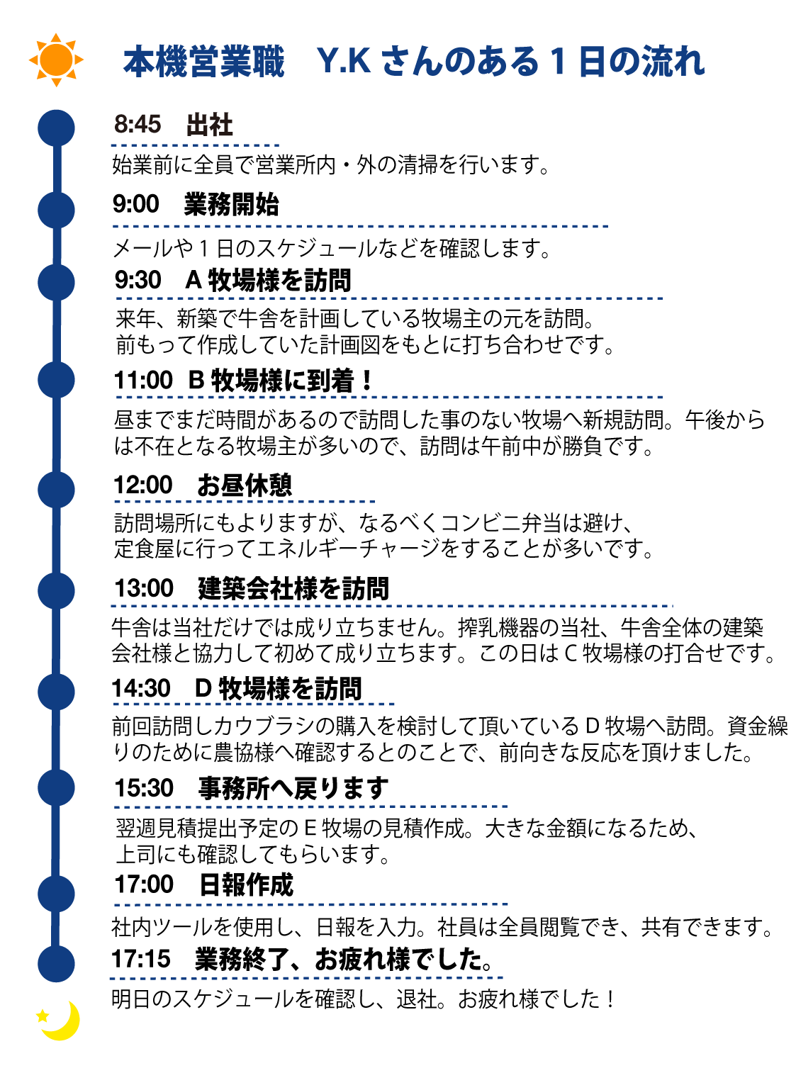 入社される方には、お客様のニーズに合わせた製品のご提案やご希望の牛舎レイアウトの聞き取り、また社内の関係部署との連携など幅広い職務をご経験頂けます。