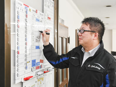今日のお客様は、搾乳ロボットVMS™に興味をお持ちの様子。訪問前に再度、資料を確認してしっかり説明できるように最終チェック。