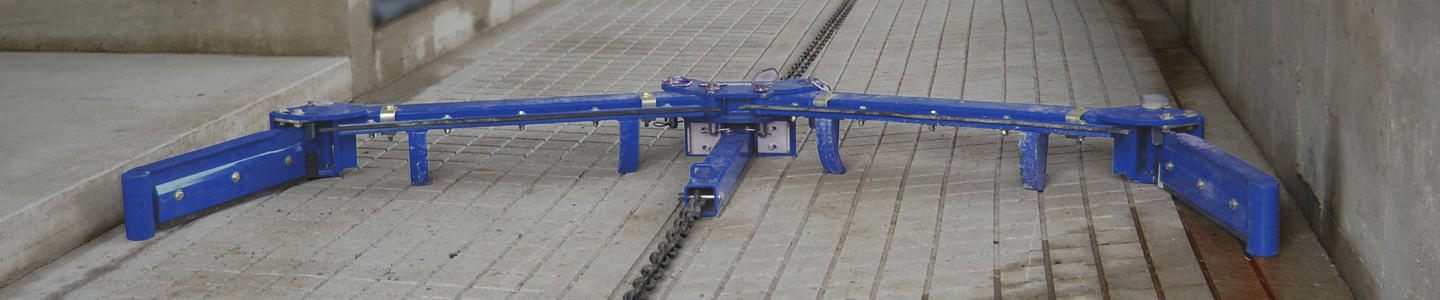 This blade design is ideal for large volumes of manure, especially with straw bedding. The V formation gathers the manure cleanly and keeps pushing big loads forward, without spilling any back into the clean alley. Available with changeable blades: urethan blades with rubber mats, metal blades with concreate or Hardox-metal blades to tough condititions.