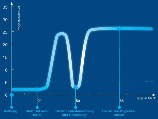 송아지를 낳은 지 몇 주가 지나면 난소 활동이 재개되고 소는 월경 주기에 들어갑니다. 자발적인 대기 기간 동안에도 RePro는 프로게스테론 수치를 분석하여 첫 번째 발정을 안정적으로 감지합니다.