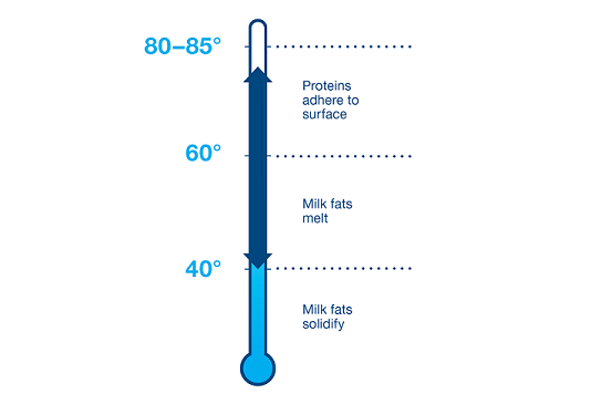 열의 역할은 다양한 물질의 용해 및 유화를 개선하고 세제 작용을 강화하는 것입니다. 각 단계에서 적절한 온도를 사용하는 것이 중요합니다. 온도가 너무 낮으면 유지방이 굳고, 너무 높으면 유단백질이 표면에 달라붙어 제거하기 매우 어려워집니다.