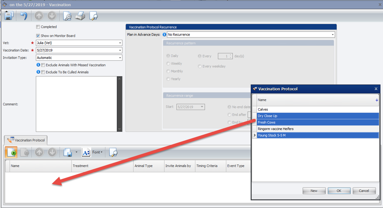 Atėjus į tvartą ir dirbant ten su savo gyvuliais patogiausia vienoje vietoje turėti sąrašą darbų, kuriuos reikia atlikti. Dirbdami su skiepijimo moduliu pastebėjome, kad būtų kur kas patogiau, jei galėtume tarpusavy suderinti skirtingus protokolus, skirtus skirtingoms gyvulių grupėms, tarkim: veršeliams, telyčioms, pieną duodančioms ir užtrūkusioms karvėms per vieną ir tą patį veterinaro vizitą. Todėl „DelPro FarmManager 5.5“ papildėme galimybe susieti kelis skirtingus protokolus su tuo pačiu veterinaro vizitu. Užuot planavus kelis vizitus, kurių rezultatas – parengiamos kelios ataskaitos, nuo šiol užtenka sukurti vieną vienintelį skiepijimo vizitą. Tuomet pakviestų gyvulių lange galėsite labai paprastai ir lengvai užregistruoti, kad jie buvo paskiepyti. Kitas praktiškas pavyzdys, kai yra du nagų trumpinimo protokolai: vienas skirtas pieną duodančioms karvėms, kurių nagos trumpinamos 2 kartus per laktaciją, o kitas – kai karvės užtrūksta, ir visa tai pateikiama vienoje ataskaitoje.