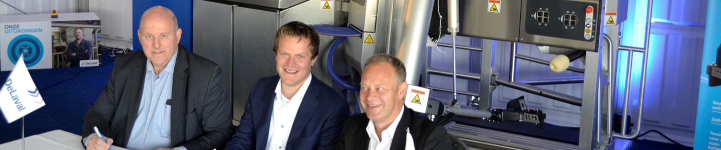 Van links naar rechts op de foto: Geert-Jacob van Dijk (Vice President Market Area Benelux), Andre Arfman (voorzitter NAJK) en Jonas Hallman (Executive Vice President BA Milking Systems).