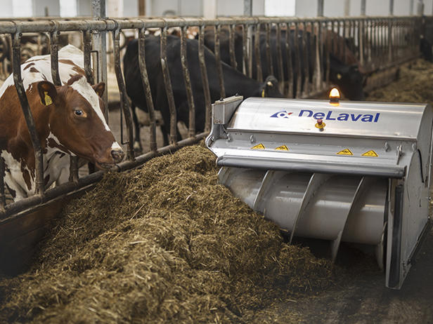 DeLaval OptiDuo™ er en automatisk fôrskyver som blander fôret, noe som gjør at det blir mer appetittvekkende for kua, og hindrer at fôret trykker seg sammen. Dette kan føre til høyere fôropptak og mer melk. Den unike utførelsen av den roterende skruen gjør at fôret skånsomt flyttes nærmere dyra.