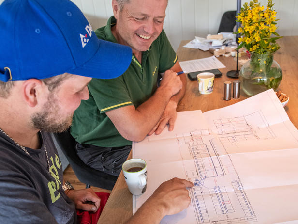 – Da ble alt lagt på is en stund. Men så kom Jørgen med forslag. Vi la opp til å ha fôrbrett i det gamle betongfjøset, lage et påbygg med fire liggebås-rekker, forteller Matias. I tillegg planla de en ny fôrsentral i tilknytning til det eldste fjøset. Opprinnelig var planen å ha kjeller og flyterenner, men på grunn av vanskelige grunnforhold gikk ikke det.