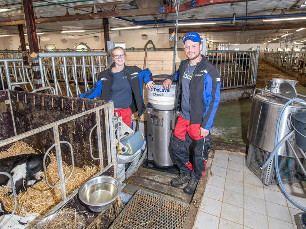 – Kalvene har chip i ørene som leses i automaten, slik at de følger individuelle fôrplaner som vi legger inn. De har fri tilgang på melk og vi legger inn en gradvis avvenning til de er fullt avvendt etter 70 dager. Da er de helt rolige når de ikke får melk lenger. Kalvene har blitt mye finere etter at vi tok i bruk automaten, sier Matias.