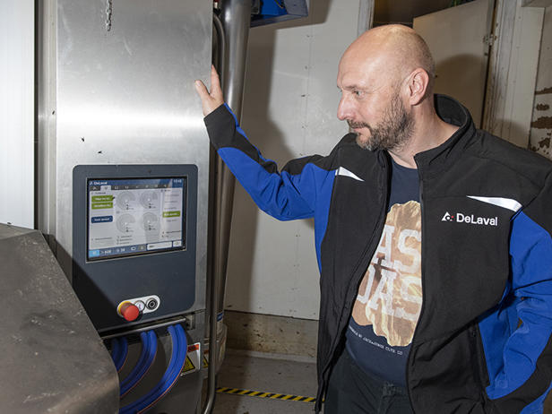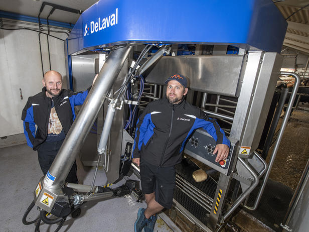 – Den nye er jo litt større, men det er sagt at det skal være plass til å byte den ut med forgjengeren. Hos oss var det ikke mye å gå på, men det holdt med fem centimeter, forteller Svelmo og Unsgård, som er imponert over hvor effektivt installatørene arbeidet. Selv om det var trangt og utfordrende tok det bare åtte timer fra siste ku ble melket i den gamle roboten til første ku sto i den nye.