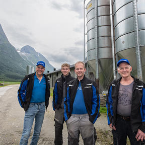 Vi sitter sammen med Jonas (18), Geir Thomas (41), Per Jarle (59) og Jakob (71) i fjøskontoret hos samdrifta Myklebust Landbruk i Myklebustdalen i Gloppen. I vinduet ut mot fjøset ser vi den nye VMS'n, som de tok i bruk i september 2021, melke den ene kua etter den andre. Med en melkekvote på nær 700 tonn, er det rundt 75 kyr som skal gjennom roboten. Det er derfor en verdifull kapasitetsøkning samdrifta har fått etter at de byttet ut den gamle Classic-modellen med den nye 310-modellen.