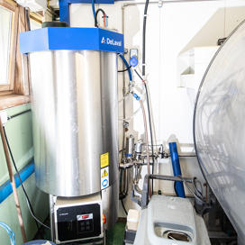 I melkerommet står en 8000 liters tank. I tillegg har de en DeLaval buffertank, som gjør at de ikke behøver å stoppe melkinga i påvente av rengjøring av hovedtanken etter at melkebilen har vært der.