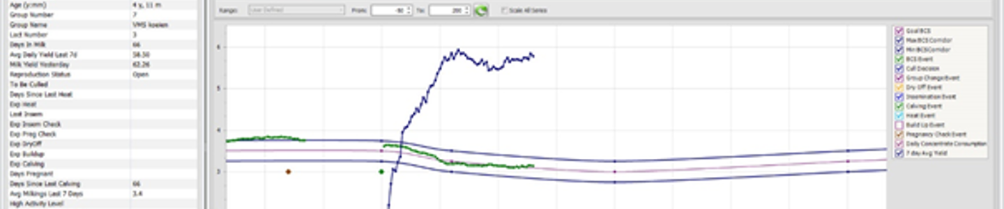 Aby pomóc znaleźć te krowy, kamera punktowej oceny kondycji DeLaval BCS ocenia krowy co 0,25 punktu i podaje 2-tygodniowy i 4-tygodniowy trend. Kondycję pod koniec poprzedniej laktacji można wykorzystać jako punkt odniesienia, aby sprawdzić straty i pomóc zaplanować leczenie tam, gdzie jest to konieczne, aby zmniejszyć negatywne skutki ketozy.