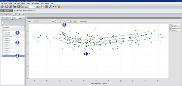 W poniższym przykładzie po prawej stronie ekranu możemy wybierać pomiędzy różnymi grupami w obrębie stada (1), różnymi grupami technologicznymi (2) lub selekcjami utworzonymi przez użytkownika (3). Możemy również ustawić zakres dni, który chcemy zobaczyć na wykresie (4).