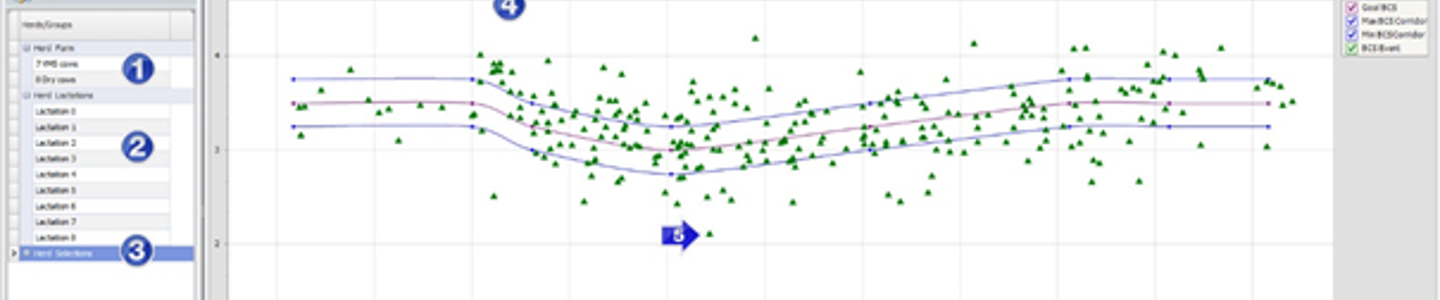 Rozkład stada BCS pokazuje wszystkie najnowsze wartości BCS dla poszczególnych krów na jednym wykresie. Hodowca widzi zwierzęta (każdy zielony trójkąt to krowa) rozproszone według dni laktacji (poziomo) i wartości BCS (pionowo). Fioletowa linia wskazuje wartość docelową podczas laktacji. Wokół niej widzimy dopuszczalny zakres kondycji ustawiony dla rasy (zaznaczony niebieskimi liniami).