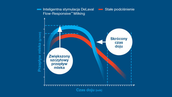 System dojarni, który nie reaguje na przepływ mleka u krów, traci możliwość szybszego dojenia i pomagania w ochronie stanu strzyków i dobrostanu zwierząt. Dzięki DeLaval Flow-Responsive™ w dojarni może po raz pierwszy automatycznie dostosowywać kluczowe parametry, aby lepiej śledzić i lepiej zachęcać do przepływu mleka u krów.