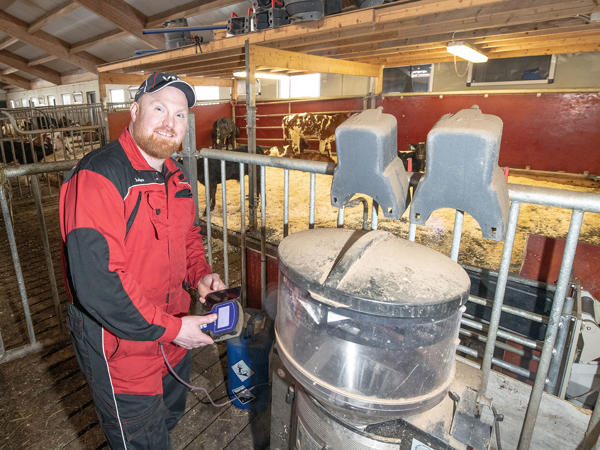 – Jag har bara använt färsk mjölk. Jag har standardutfodring med upp till tio liter mjölk per dag i 60 dagar, innan mängden trappas ner. Totalt är det runt 60 kalvar som använder automaten under ett år, förklarar han.
