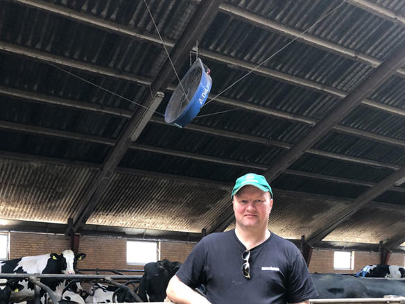 ”Jag upplevde att luften i ladugården var varm och tung, och jag kunde se att korna led. Vi har en gammal ladugård där det inte kommer in mycket vind som cirkulerar luften. Efter att vi satte in fläktarna har jag fått en helt annan luft i ladugården. Och när det är riktigt varmt ökar hastigheten på fläktarna, så att korna kyls ner. Även i samlingsfållan där 100 kor står tätt kan vi motverka värmen med hjälp av fläktarna. Det har varit ett nöje att uppleva”, säger Carsten.