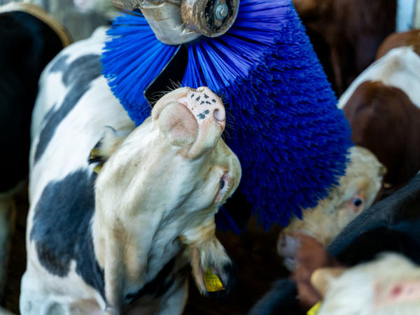 – I två år har vi har haft borstar på test i fyra av de åtta grupperna som vi har i stallet. Vi är mycket nöjda med den. Vi har den tidigare modellen frihängande ryktborste i våra mjölkkostallar och vi ser att den nya borsten är mycket mer robust och håller för tjurarnas tuffa tag, berättar Anton.