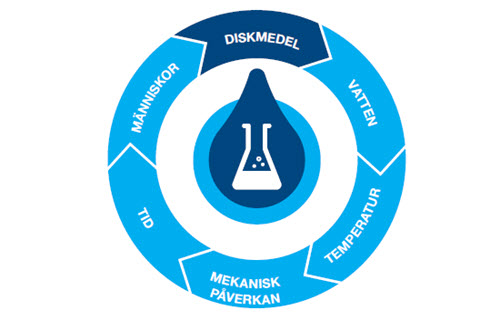 När vi utvecklar ett diskmedel kombinerar vi kemikalier med olika egenskaper. Här intill beskrivs några olika ingrediensers egenskaper.
