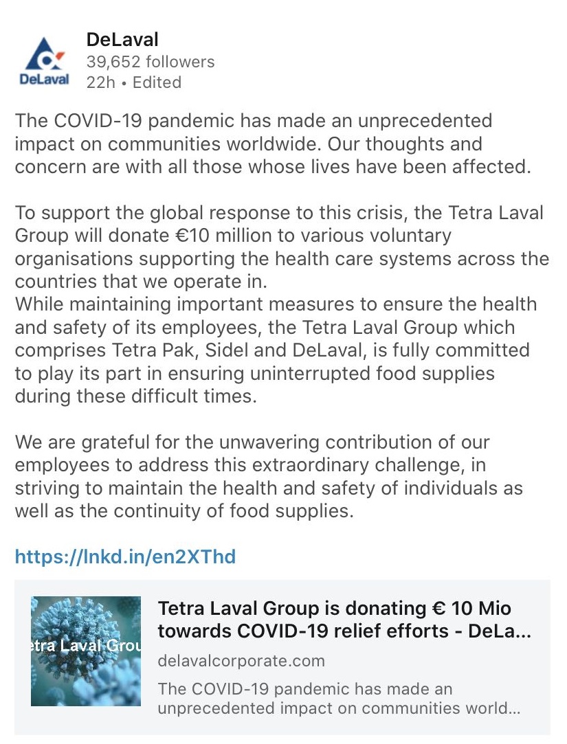 利乐拉伐集团也将继续坚持一切重要的防护措施,保护我们全球员工的健康和平安。利乐拉伐集团下属的利乐、利拉伐和西得乐三家公司,都将尽一切所能来保证困难时期的食品供应。